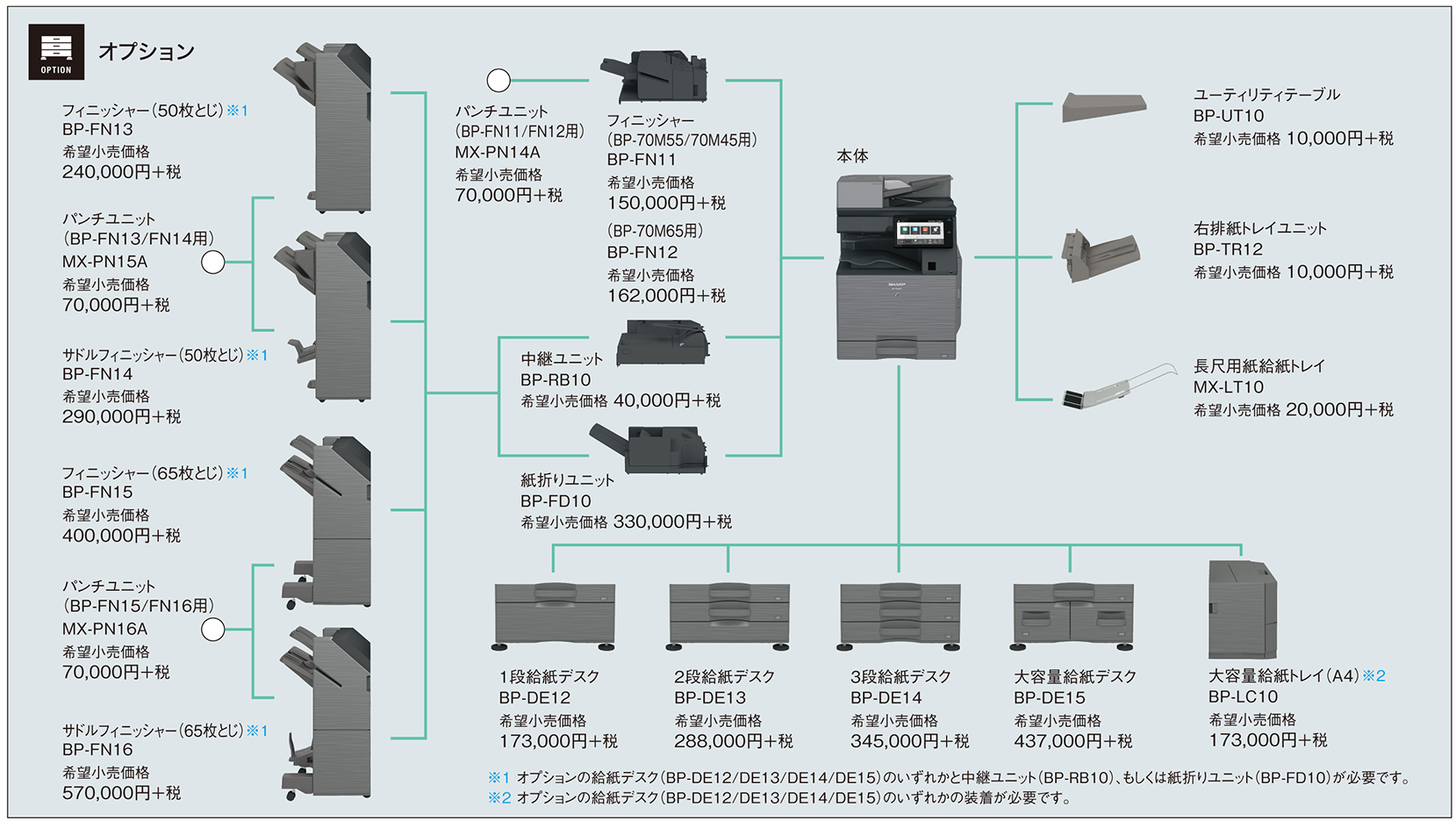参考までにフィニッシャーやパンチユニットなどのオプション相関図を以下に掲載しておこう。導入について詳しくはスタッフまでお問い合わせしてほしいのじゃ。