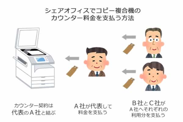 毎月発生するカウンター料金の支払いは代表社が行うが、利用した分は他二社が代表社に支払う。