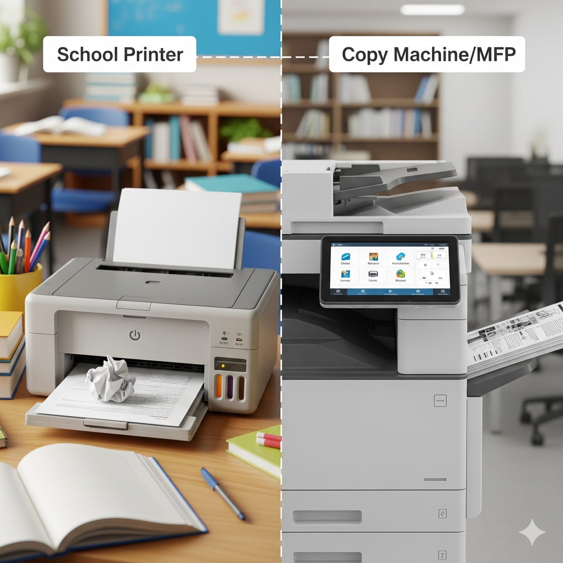 学校にある印刷機とコピー機(複合機)の違いが分からない。どっちを使えばいいの?