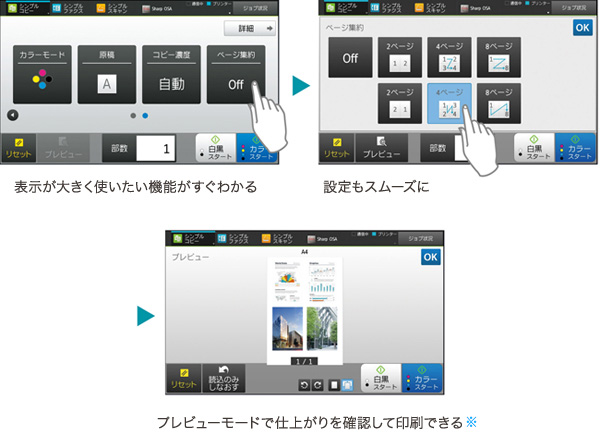 コピーで印刷する前やFAXのデータを印刷する前に、液晶の操作パネル上で印刷プレビューを確認することができる「見てからコピー機能」機能を搭載。不要なデータはその場で削除でき、必要なデータだけを印刷・メール転送できるので、印刷ミスや迷惑FAXで発生する無駄なコストを大幅に削減することができます。OAランドでも実際に使っている便利な機能です。