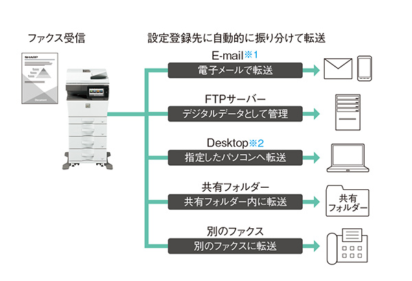 MX-2630FNで受信したFAXは、いつも持ち歩く携帯電話やタブレット端末などに「E-mail転送設定」をかけることができます。重要なFAXでも外出時に確認できるため、外回りが多いお客様はとても活用しています。また、指定したパソコンやサーバーにも転送できるので、FAXを紙出しすることなくパソコン上で確認することができます。