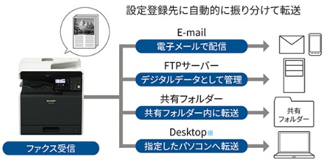 受信したFAXは、いつも持ち歩く携帯電話やなどに「転送設定」をかけることができます。重要なFAXでも外出時に確認できるため、外回りが多いお客様はとても活用されています。また、指定したパソコンやサーバーにも転送できるので、FAXを紙出しすることなくパソコン上で確認することができます。