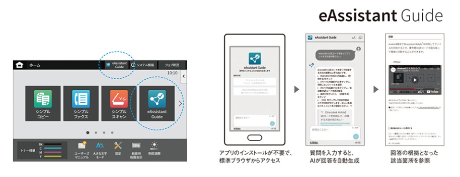 「eAssistant Guide」は、シャープが提供するAI搭載サポート機能で、複合機の操作やトラブル対応を支援します。スマートフォンやPCのブラウザからアクセスし、チャット形式で質問を入力すると、生成AIがトナー交換、紙詰まり、スキャン設定などの手順を即座に案内します。