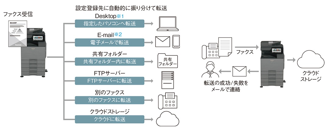 さらに、後継モデルでは対応していなかったクラウドストレージへ直接転送も可能に。外出先やテレワークなどの遠隔地でも簡単に確認できます。また、転送結果はメールでも通知されます!